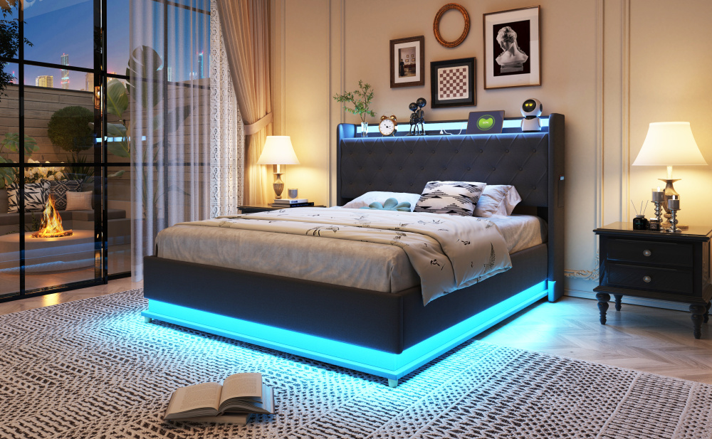 LED Polsterbett 140*200 cm mit USB-Ladeanschluss und Hydraulischer Lagerung, Ha
